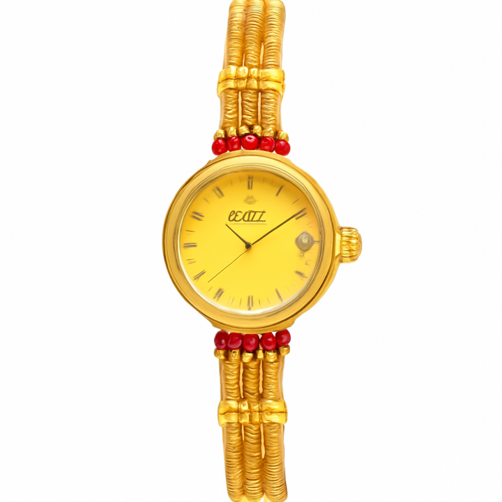 Add a touch of elegance to your wrist with this stunning gold-toned women's watch. Featuring a vibrant yellow gold dial with Roman numeral markers and a date window, this timepiece is designed for both style and functionality. The sleek gold mesh band is adorned with red gemstone accents, offering a chic and modern look that’s perfect for any occasion.